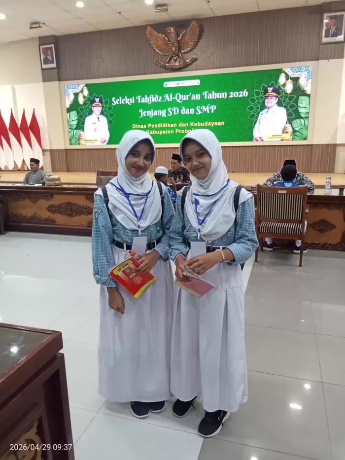 Melalui pelaksanaan seleksi Tahfidz Al-Qur'an hari ke 2 (29-4-2026) bagi calon penerima Beasiswa Tahfidz tahun 2026 yang berlangsung di Ruang Madakaripura Lt. 5 Kantor Bupati Probolinggo, Refina dan Hafizah panggilan akrabnya siswa SMP Negeri 1 Paiton Kelas 9E menunjukkan komitmennya dalam kontestasi Al-Qur'an untuk mewujudkan bagian dari Visi-Misi sekolah.